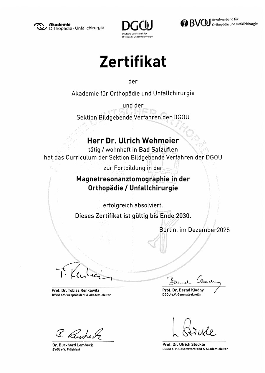 - Seit 01.10.2021 niedergelassen als Facharzt für Orthopädie in der orthopädischen Privatpraxis in Bad Salzuflen